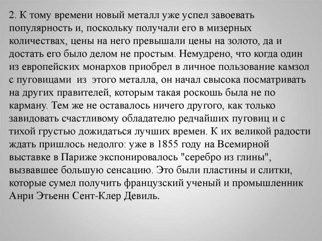 2. К тому времени новый металл уже успел завоеватьпопулярность и, поскольку получали его в мизерных