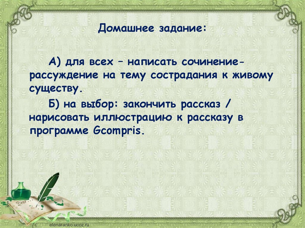 Домашнее задание:А) для всех – написать сочинениерассуждение на тему сострадания к живому