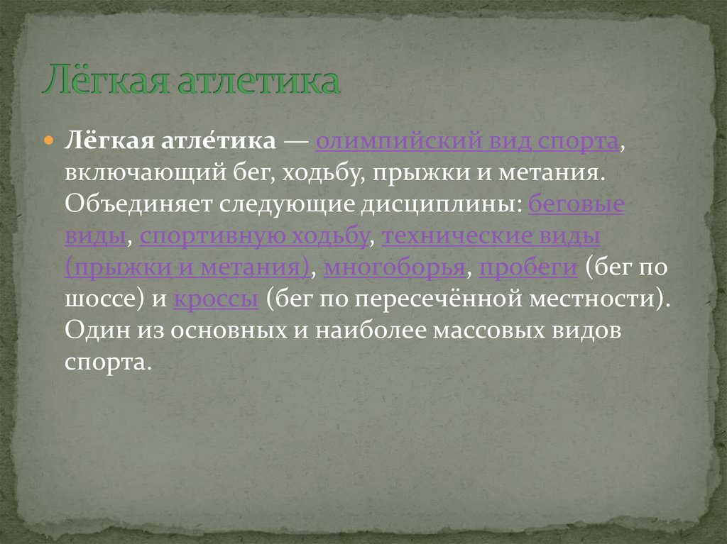 Лёгкая атле́тика — олимпийский вид спорта,включающий бег, ходьбу, прыжки и метания.