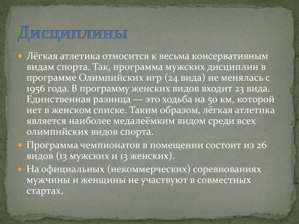 Лёгкая атлетика относится к весьма консервативнымвидам спорта. Так, программа мужских дисциплин в