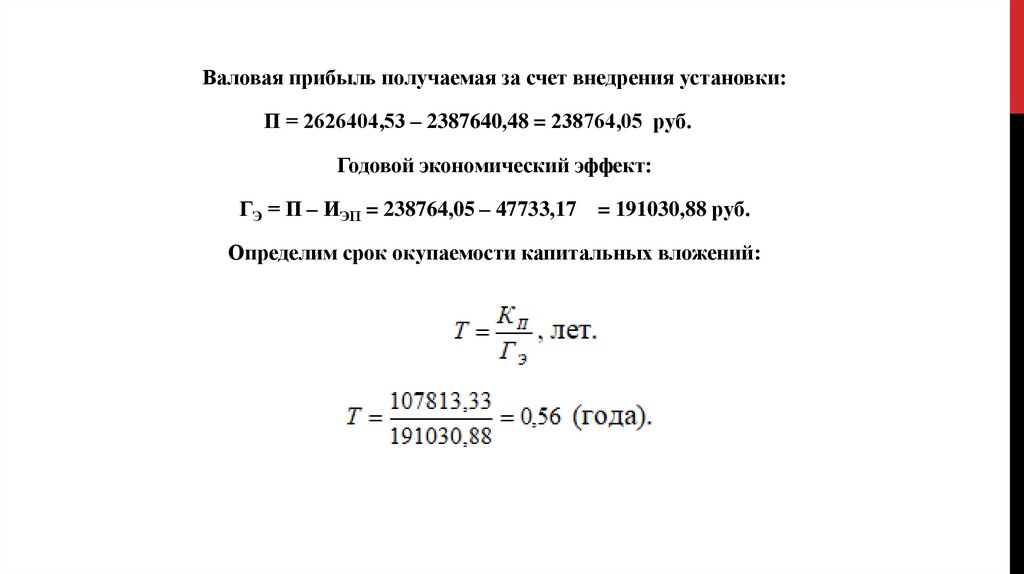 Валовая прибыль получаемая за счет внедрения установки:П = 2626404,53 – 2387640,48 = 238764,05 руб.