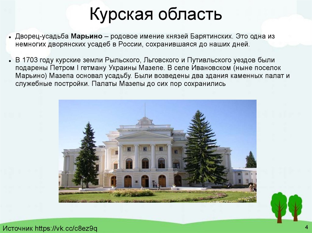 Курская областьДворец-усадьба Марьино – родовое имение князей Барятинских. Это одна из