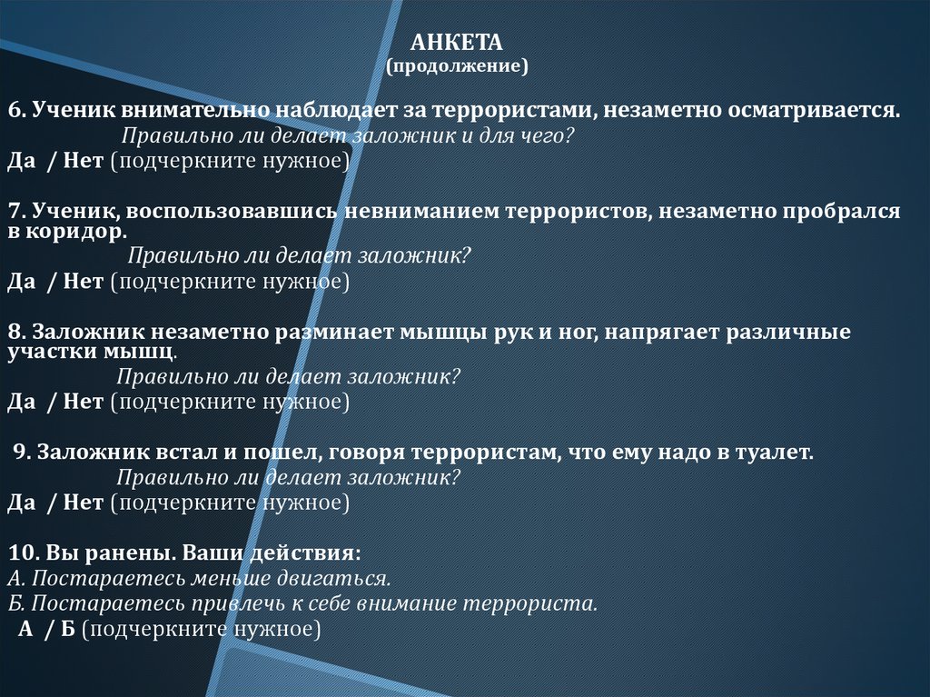 6. Ученик внимательно наблюдает за террористами, незаметно осматривается.