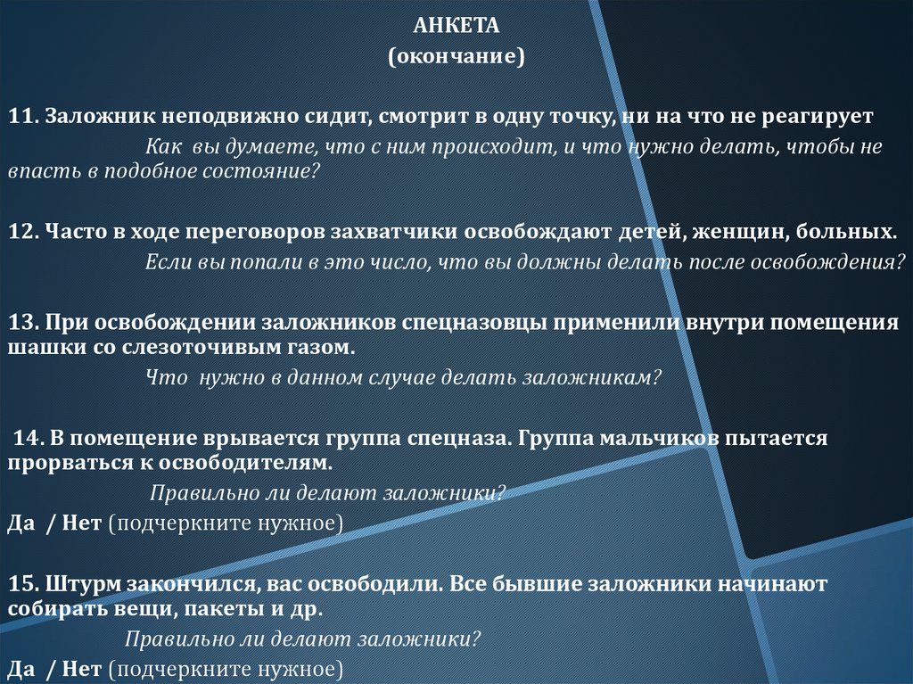 15. Штурм закончился, вас освободили. Все бывшие заложники начинают