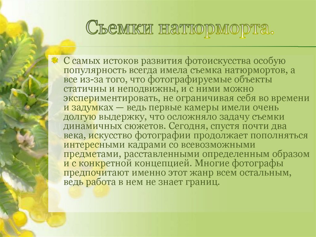 С самых истоков развития фотоискусства особуюпопулярность всегда имела съемка натюрмортов, а