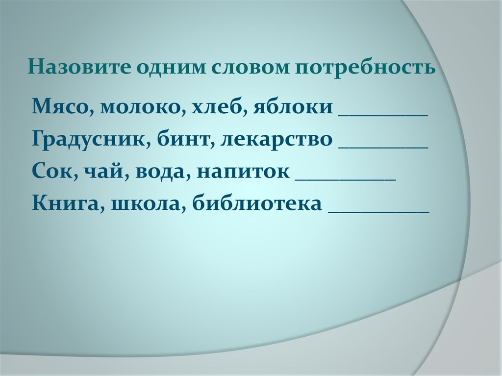 Назовите одним словом потребностьМясо, молоко, хлеб, яблоки ________