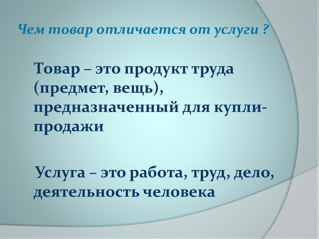 Чем товар отличается от услуги ?Товар – это продукт труда