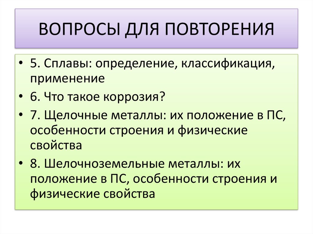 ВОПРОСЫ ДЛЯ ПОВТОРЕНИЯ• 1. Расположение металлов в ПС