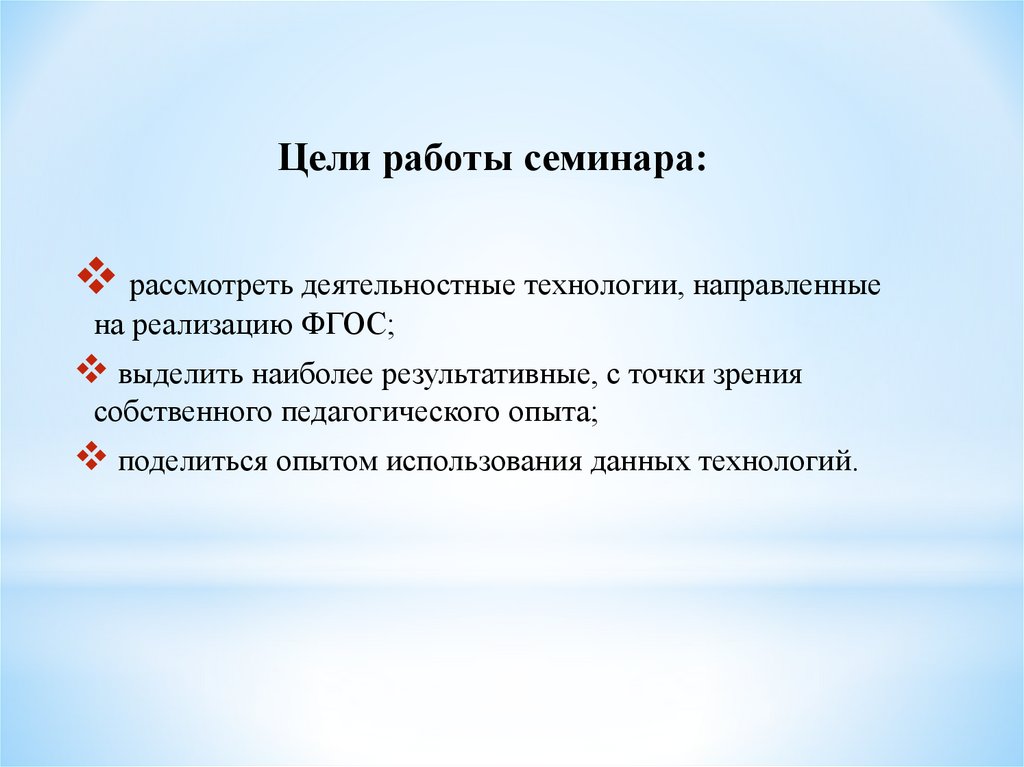Цели работы семинара:рассмотреть деятельностные технологии, направленные
