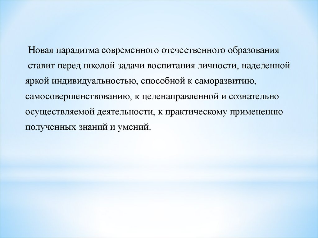Новая парадигма современного отечественного образованияставит перед школой задачи воспитания личности, наделенной