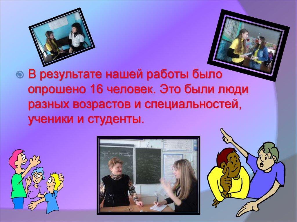 В результате нашей работы былоопрошено 16 человек. Это были люди