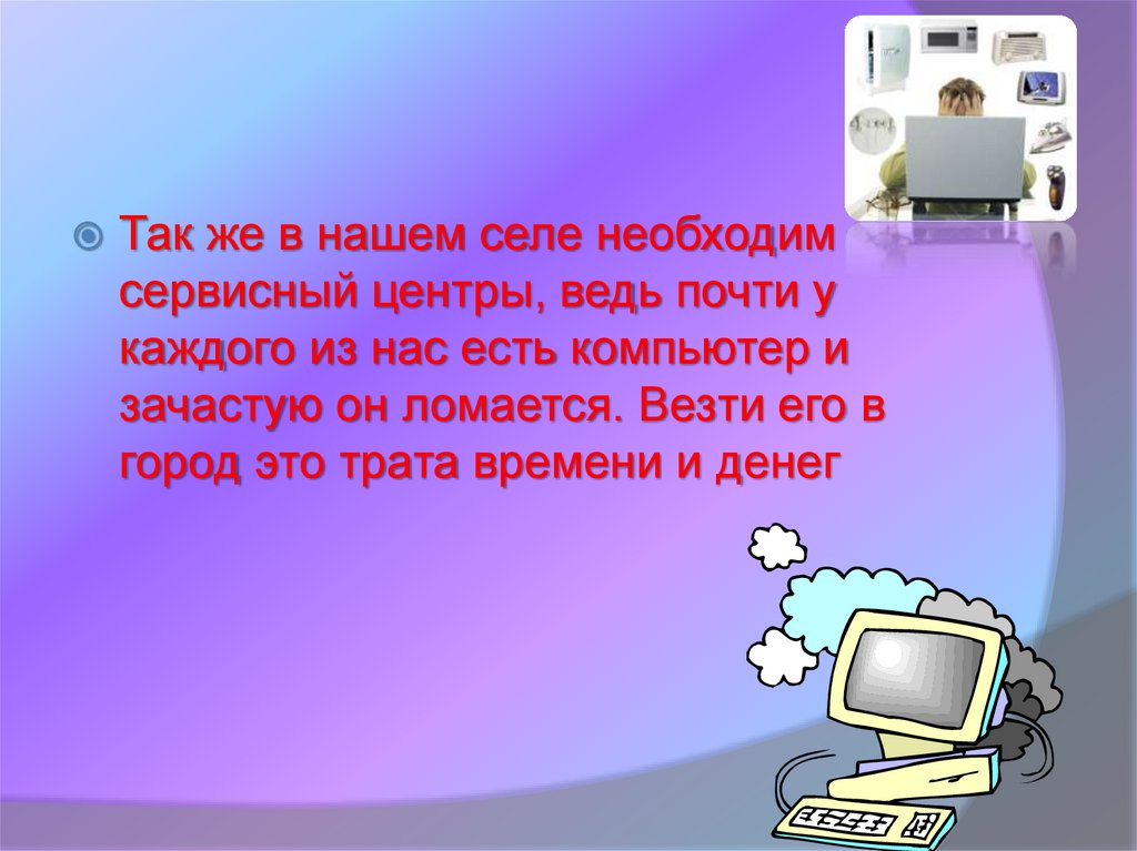 Так же в нашем селе необходимсервисный центры, ведь почти у