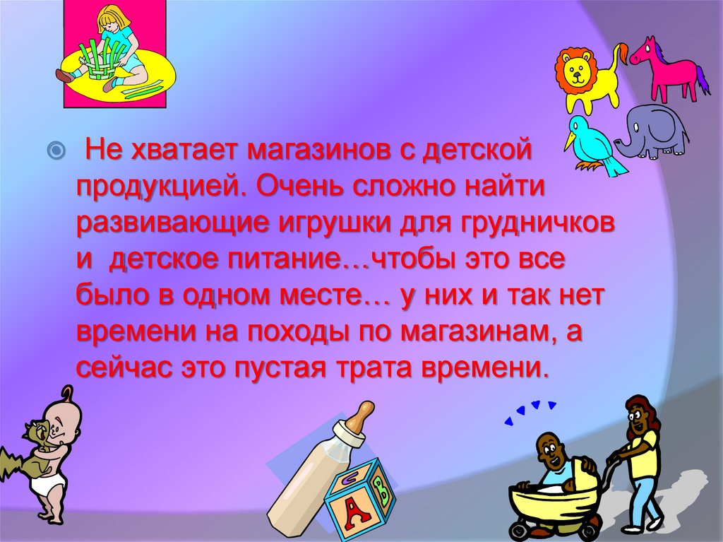 Не хватает магазинов с детскойпродукцией. Очень сложно найти