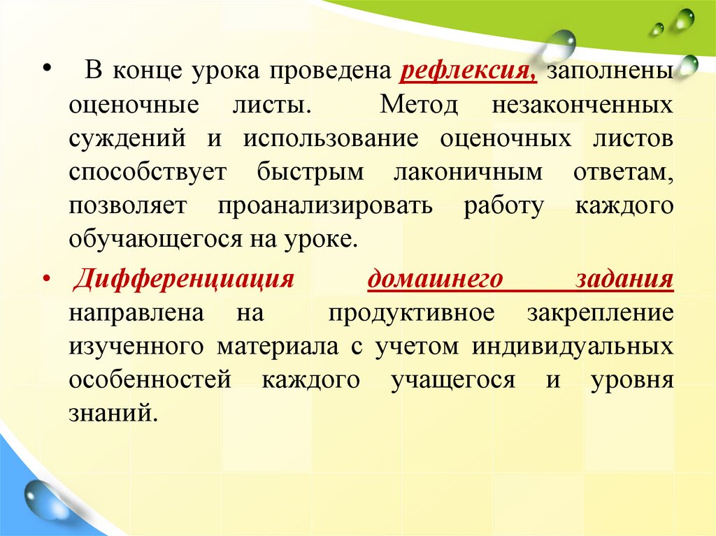 • В конце урока проведена рефлексия, заполненыоценочные листы.