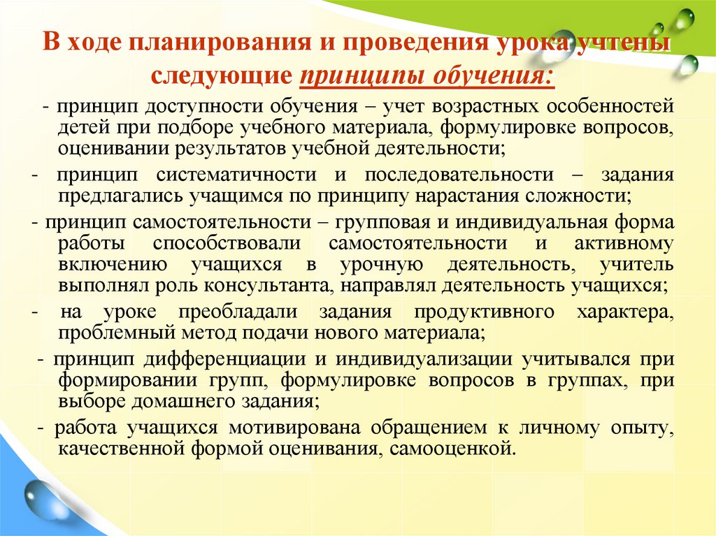 В ходе планирования и проведения урока учтеныследующие принципы обучения: