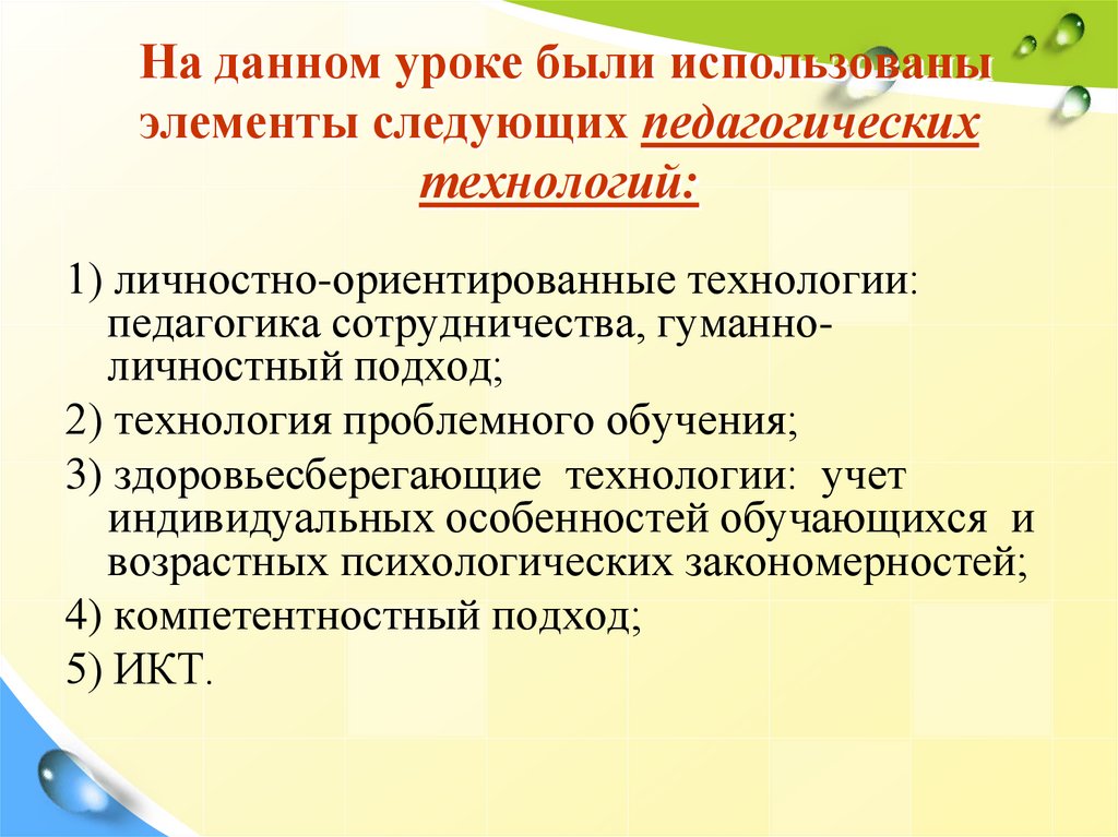 На данном уроке были использованыэлементы следующих педагогических