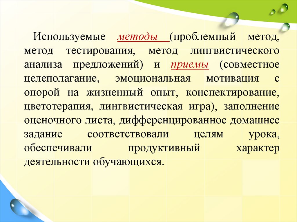 Используемые методы (проблемный метод,метод тестирования, метод лингвистического