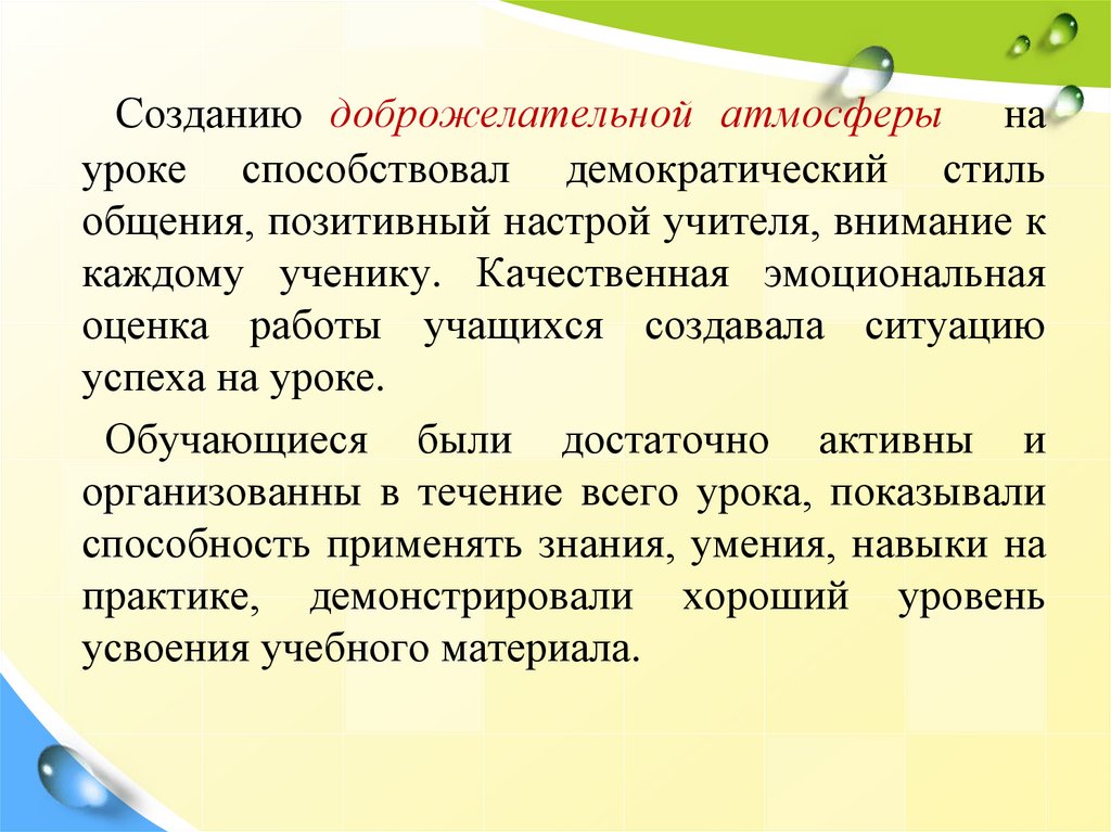 Созданию доброжелательной атмосферы науроке способствовал демократический стиль