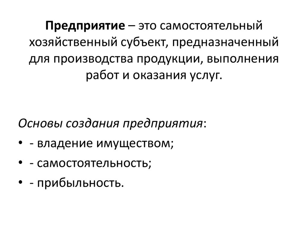 Предприятие – это самостоятельныйхозяйственный субъект, предназначенный