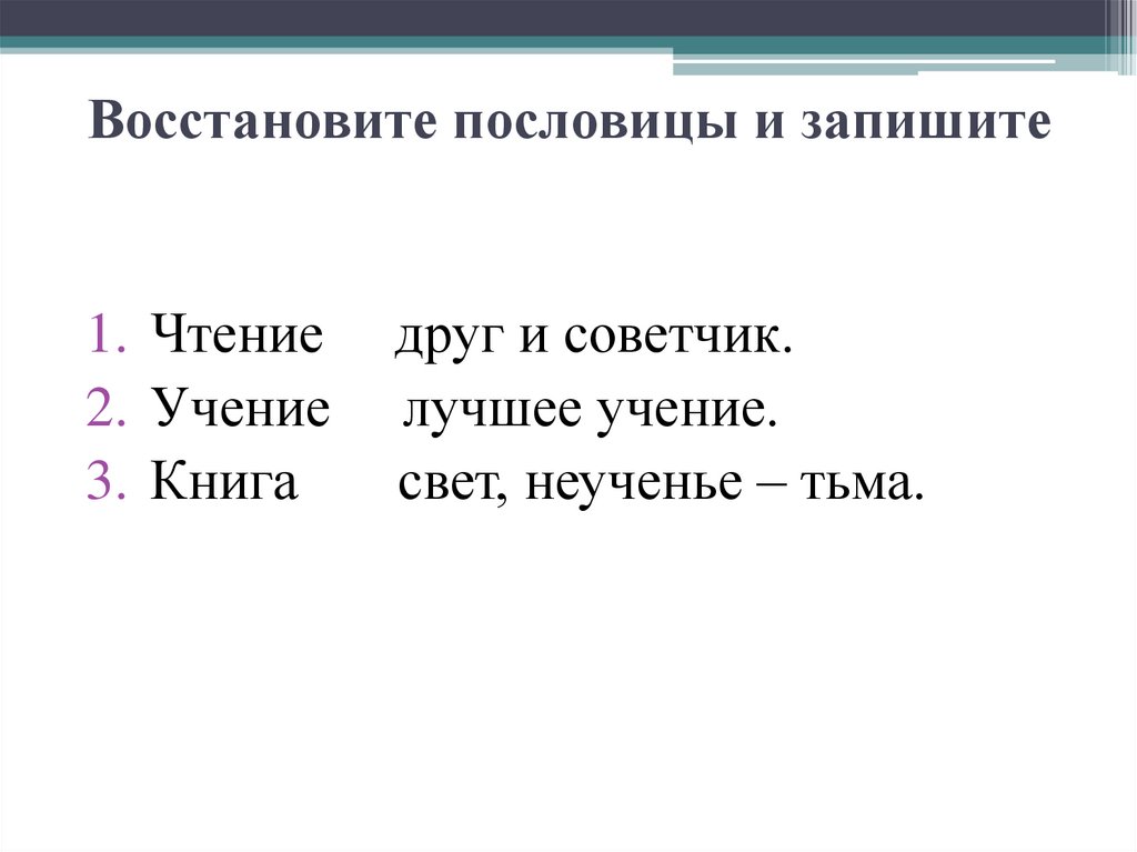 Восстановите пословицы и запишите1. Чтение