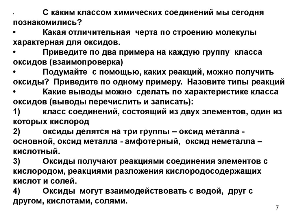оксидов (выводы перечислить и записать):