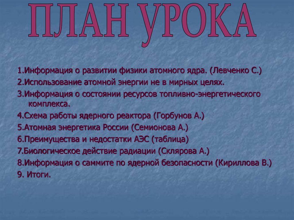 1.Информация о развитии физики атомного ядра. (Левченко С.)2.Использование атомной энергии не в мирных целях.