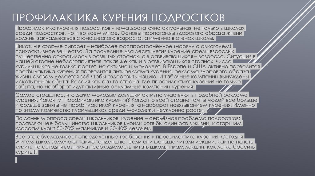 ПРОФИЛАКТИКА КУРЕНИЯ ПОДРОСТКОВПрофилактика курения подростков - тема достаточно актуальная, не только в школах