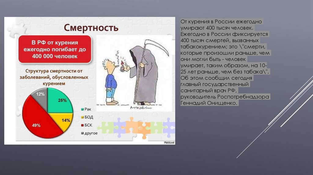 умирает, таким образом, на 1025 лет раньше, чем без табака\".