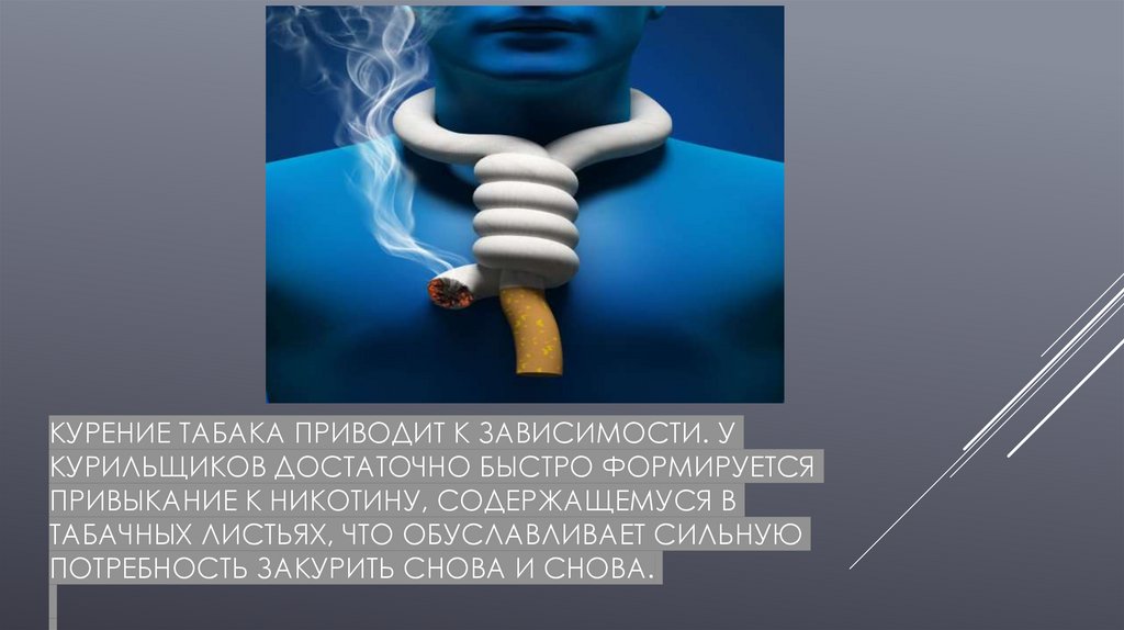 КУРЕНИЕ ТАБАКА ПРИВОДИТ К ЗАВИСИМОСТИ. УКУРИЛЬЩИКОВ ДОСТАТОЧНО БЫСТРО ФОРМИРУЕТСЯ