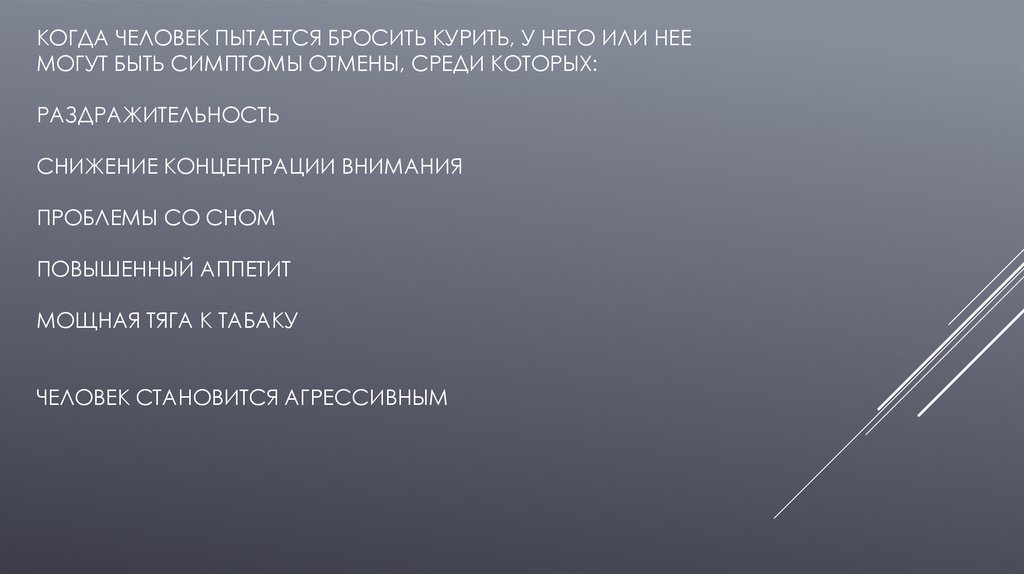 КОГДА ЧЕЛОВЕК ПЫТАЕТСЯ БРОСИТЬ КУРИТЬ, У НЕГО ИЛИ НЕЕМОГУТ БЫТЬ СИМПТОМЫ ОТМЕНЫ, СРЕДИ КОТОРЫХ: