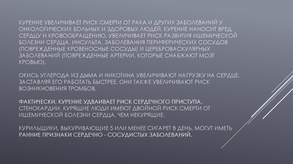 КУРЕНИЕ УВЕЛИЧИВАЕТ РИСК СМЕРТИ ОТ РАКА И ДРУГИХ ЗАБОЛЕВАНИЙ УОНКОЛОГИЧЕСКИХ БОЛЬНЫХ И ЗДОРОВЫХ ЛЮДЕЙ. КУРЕНИЕ НАНОСИТ ВРЕД