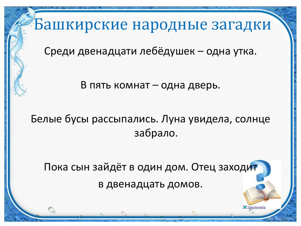 Башкирские народные загадкиСреди двенадцати лебёдушек – одна утка.