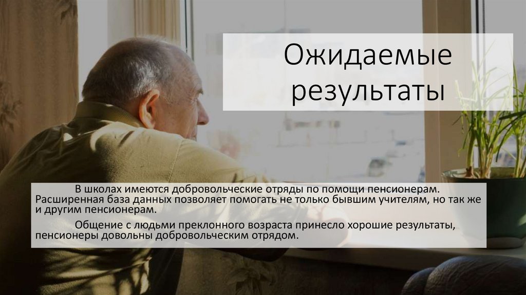 ЗадачиСоздать на базе школы добровольческий отряд, который будет помогать пенсионерам на