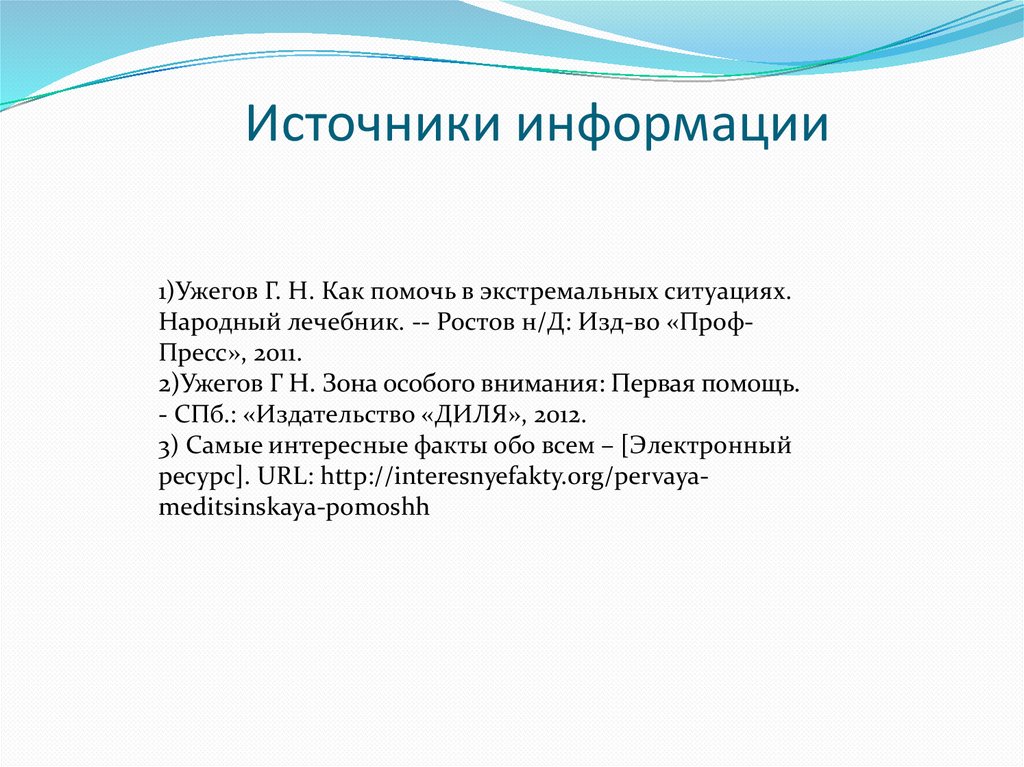 Источники информации1)Ужегов Г. Н. Как помочь в экстремальных ситуациях.