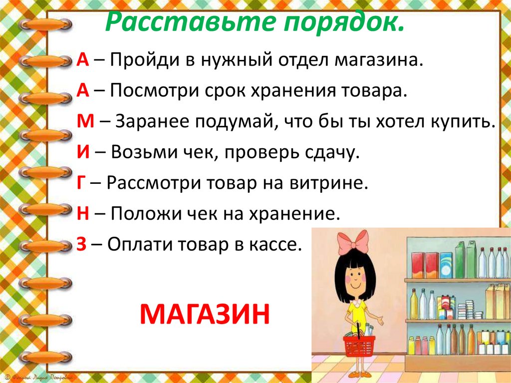 Расставьте порядок.А – Пройди в нужный отдел магазина.