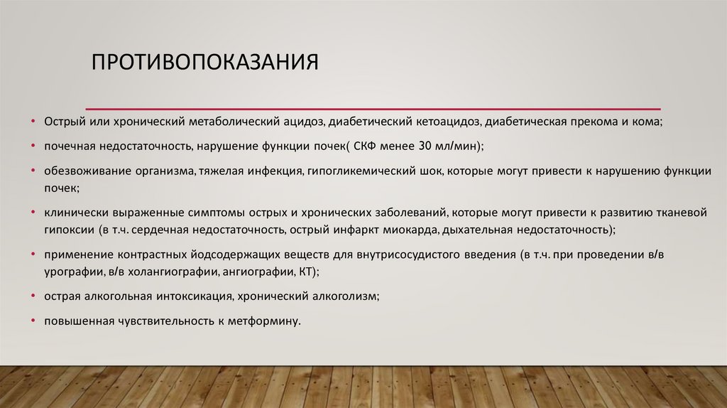 ПРОТИВОПОКАЗАНИЯ• Острый или хронический метаболический ацидоз, диабетический кетоацидоз, диабетическая прекома и кома;
