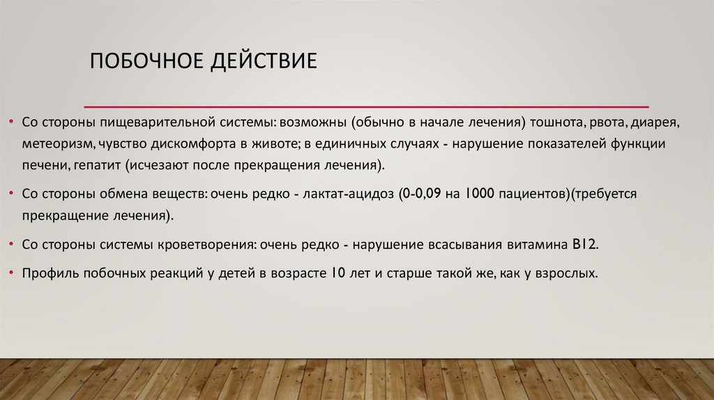 ПОБОЧНОЕ ДЕЙСТВИЕ• Со стороны пищеварительной системы: возможны (обычно в начале лечения) тошнота, рвота, диарея,