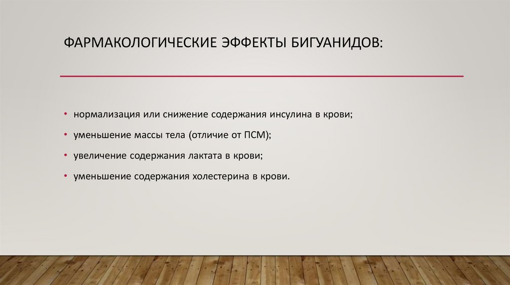 ФАРМАКОЛОГИЧЕСКИЕ ЭФФЕКТЫ БИГУАНИДОВ:• нормализация или снижение содержания инсулина в крови;
