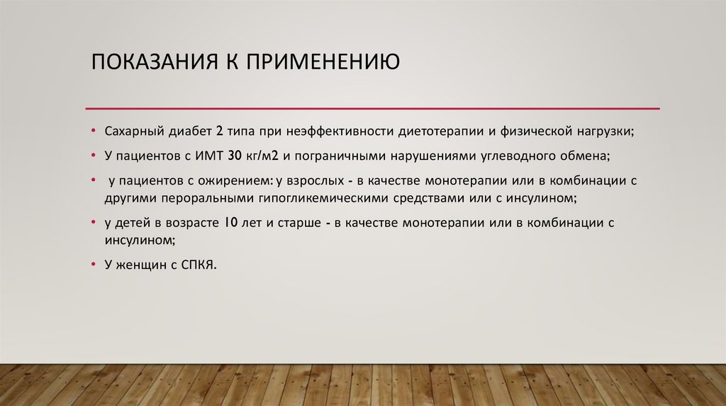 ПОКАЗАНИЯ К ПРИМЕНЕНИЮ• Сахарный диабет 2 типа при неэффективности диетотерапии и физической нагрузки;