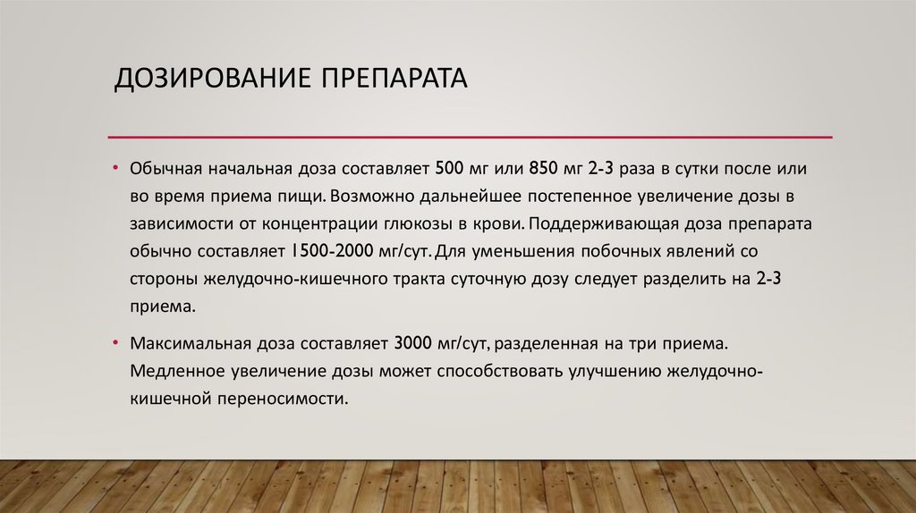 ДОЗИРОВАНИЕ ПРЕПАРАТА• Обычная начальная доза составляет 500 мг или 850 мг 2-3 раза в сутки после или