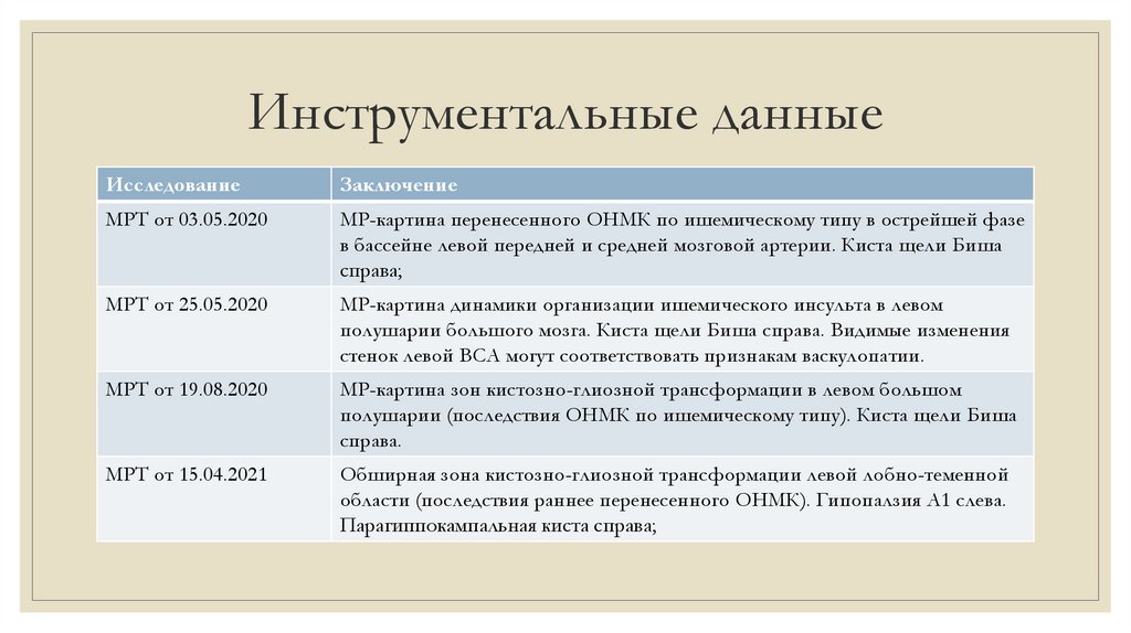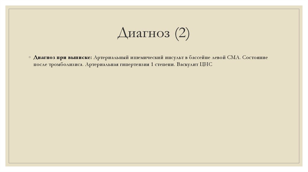 Диагноз (2)◦ Диагноз при выписке: Артериальный ишемический инсульт в бассейне левой СМА. Состояние