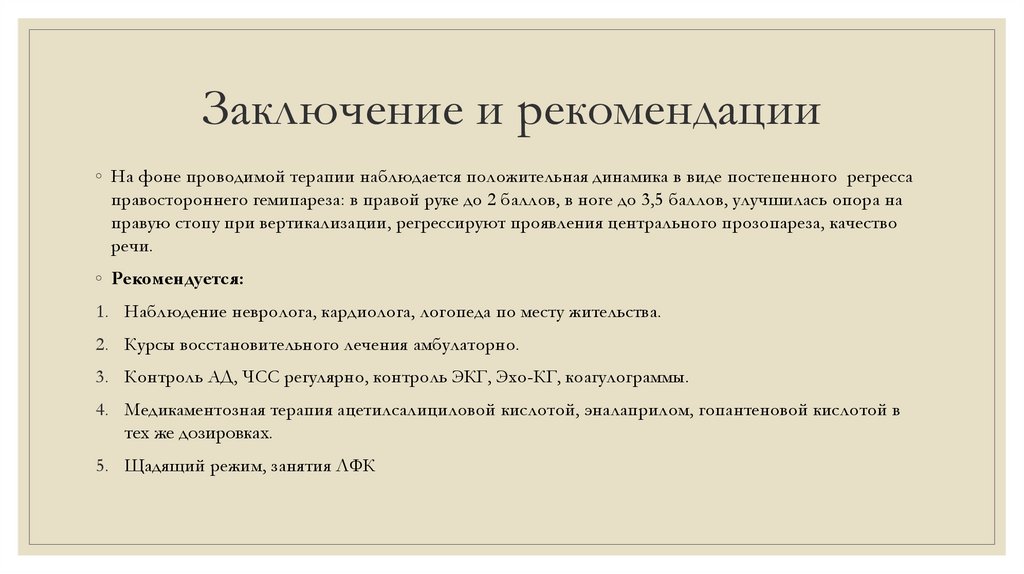 Заключение и рекомендации◦ На фоне проводимой терапии наблюдается положительная динамика в виде постепенного регресса