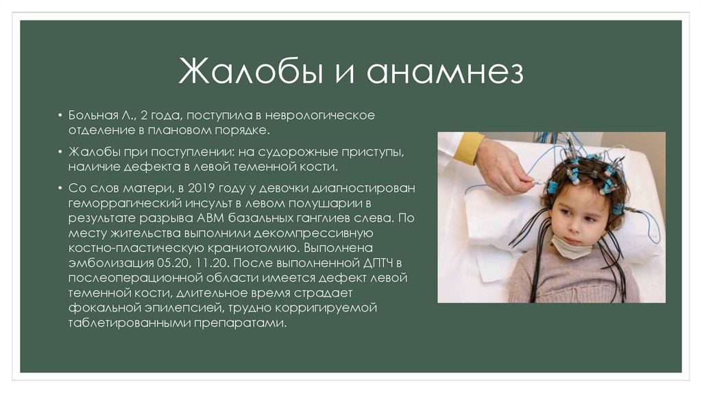 Жалобы и анамнез• Больная Л., 2 года, поступила в неврологическое