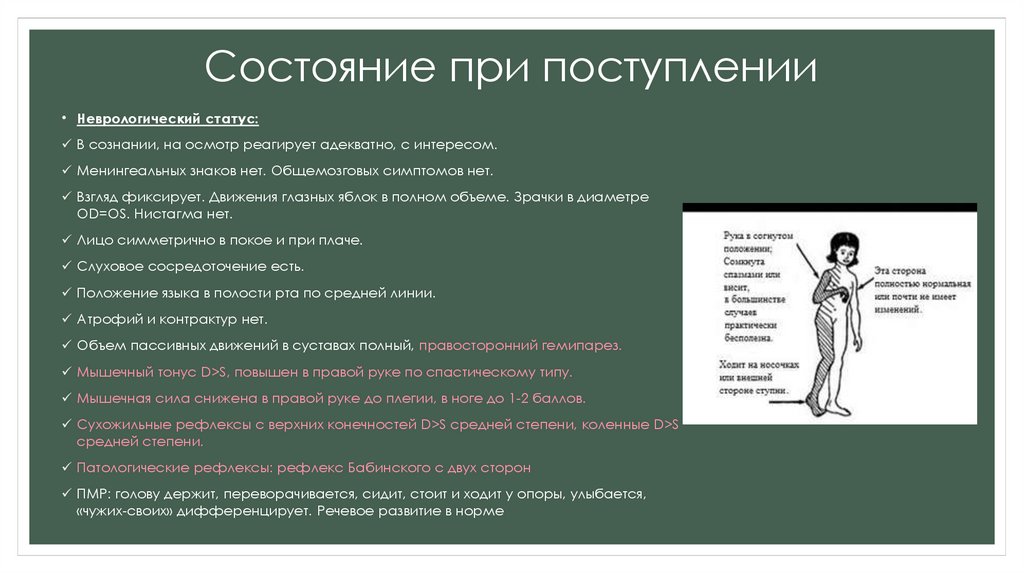 правостороннего гемипареза: в правой руке до 2 баллов, в ноге до 3,5 баллов, улучшилась опора на