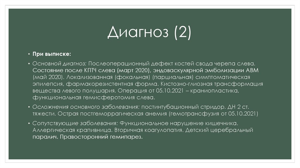 • Основной диагноз: Послеоперационный дефект костей свода черепа слева.