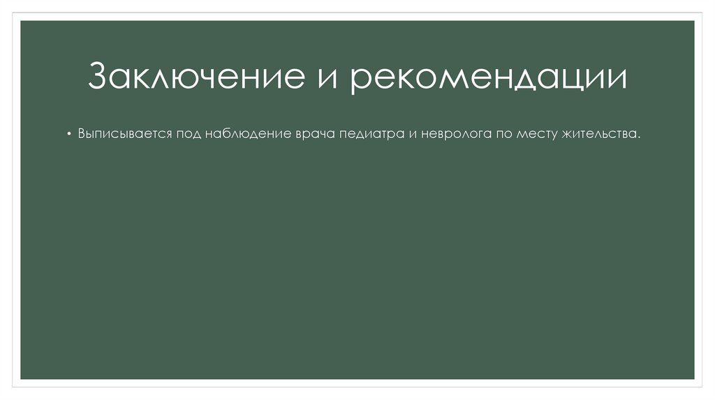 Заключение и рекомендации• Выписывается под наблюдение врача педиатра и невролога по месту жительства.