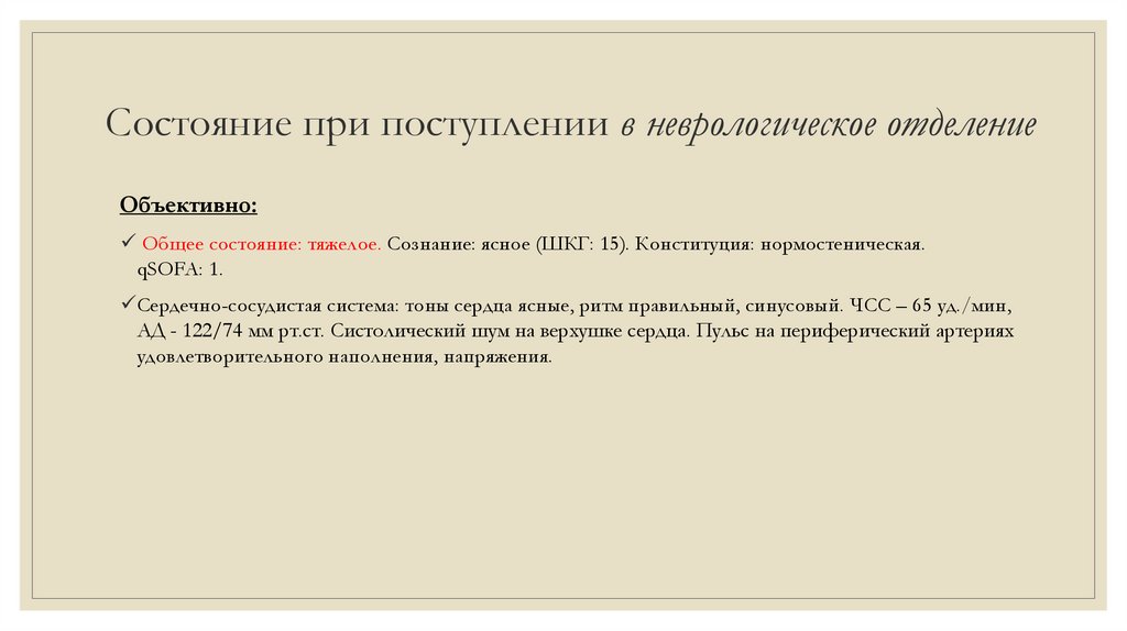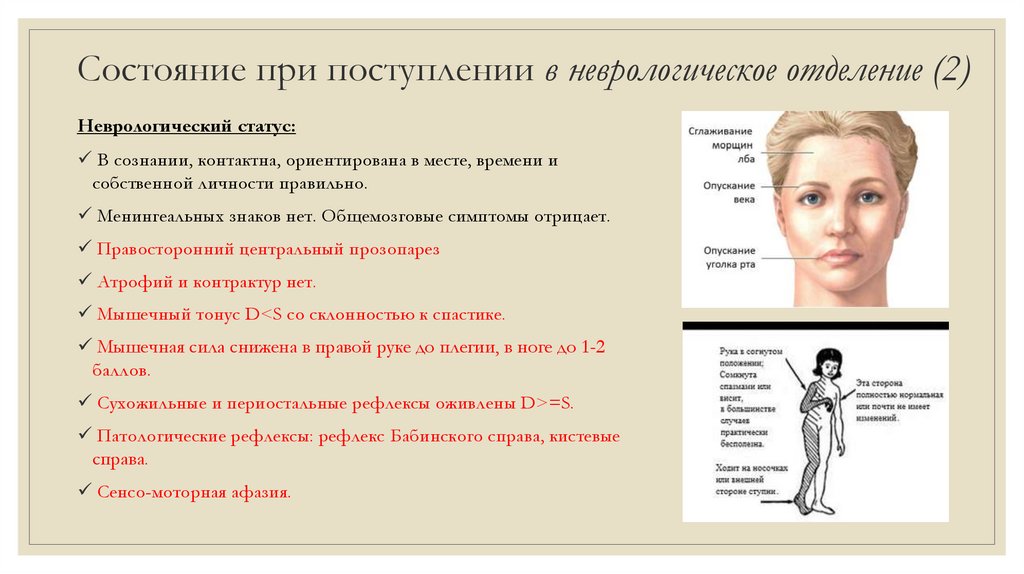 Состояние при поступлении в неврологическое отделение (2)Неврологический статус: