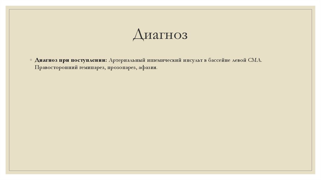 Диагноз◦ Диагноз при поступлении: Артериальный ишемический инсульт в бассейне левой СМА.