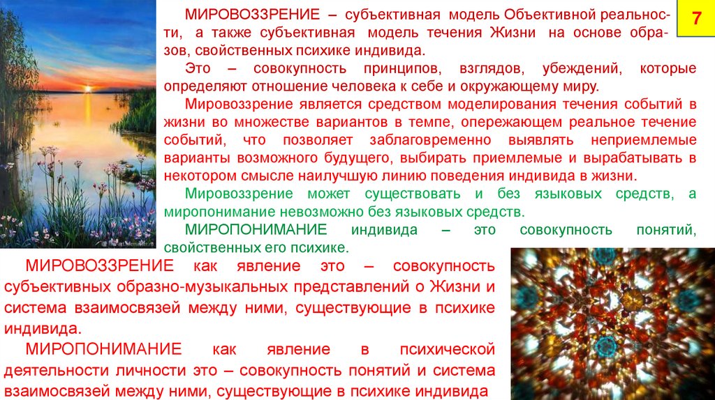 МИРОВОЗЗРЕНИЕ – субъективная модель Объективной реальнос- 7ти, а также субъективная модель течения Жизни на основе обра7