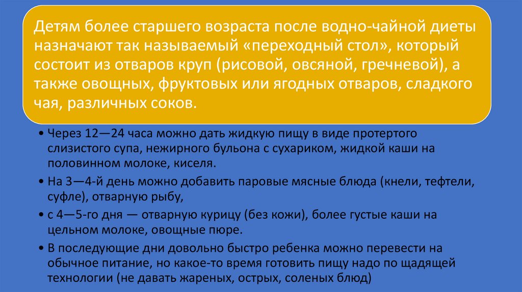 Детям более старшего возраста после водно-чайной диетыназначают так называемый «переходный стол», который